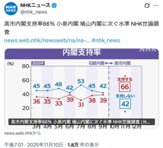 NHKが公表した最新の世論調査で、高市内閣の支持率が「支持する66%」「支持しない42%」と発表された。だが、この数値の合計が100%を超えていることから、SNS上では「計算が合わない」「NHKの調査どうなっているのか」といった指摘が相次いでいる。