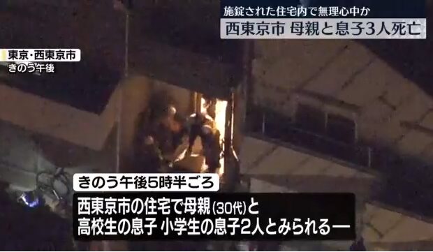 私が目にした報道によれば、東京・西東京市の住宅で母親とみられる30代の女性と、息子3人とみられる計4人が倒れているのが見つかり、その後、全員の死亡が確認されました。発見のきっかけは帰宅した父親からの通報で、自宅は内側から施錠され、チェーンもかかっていたと伝えられています。警察官と父親が室内に入り、複数の遺体を確認したとされています。