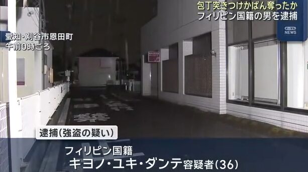 19日夜、愛知県刈谷市の信用金庫の駐車場で女性が刃物を突き付けられかばんを奪われた事件で、フィリピン国籍の男が逮捕されました。 強盗の疑いで逮捕されたのは、フィリピン国籍のキヨノ・ユキ・ダンテ容疑者(36)です。