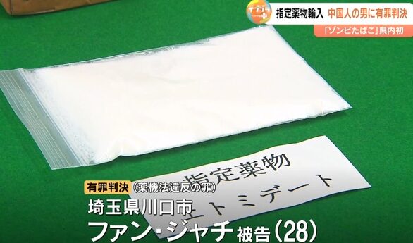 今年7月「ゾンビたばこ」とも呼ばれる指定薬物「エトミデート」を、違法に輸入した中国人の28歳の男に拘禁刑2年6か月、執行猶予4年の有罪判決が言い渡されました。薬機法違反の罪で有罪判決を受けたのは、中国籍で埼玉県川口市のファン・ジャチ被告(28)です。判決によりますと、ファン被告は今年7月、別の中国籍の男らと共謀して指定薬物「エトミデート」およそ100グラムを違法に輸入しました。