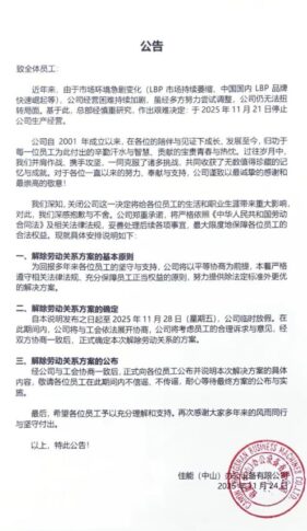 労働法および関連規定に基づき、**2025年11月28日(星期五)**に会社は操業停止となります。この期間中、会社は従業員との十分な意思疎通を行い、合理的な要望を聴取し、双方の協議を経て、正式に労働関係解消方案を確定します。