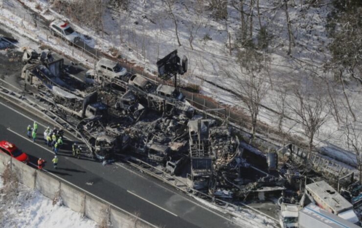 事故当時、現場周辺では雪が降っており、路面の凍結が懸念される状況でした。実際に、当該区間では時速50キロの速度規制が行われていたとされています。県警の説明では、最初にスリップしたとみられるトラックが道路をふさぐ形で横向きに停止し、そこへ後続の大型トラックが追突したことが事故の発端とみられています。その後、後続車両が次々と巻き込まれ、事故は約300メートルにわたって連続的に発生しました。中央分離帯が大きく曲がり、車両がへこみ、焼け焦げて折り重なる状態となっていたことが伝えられています。