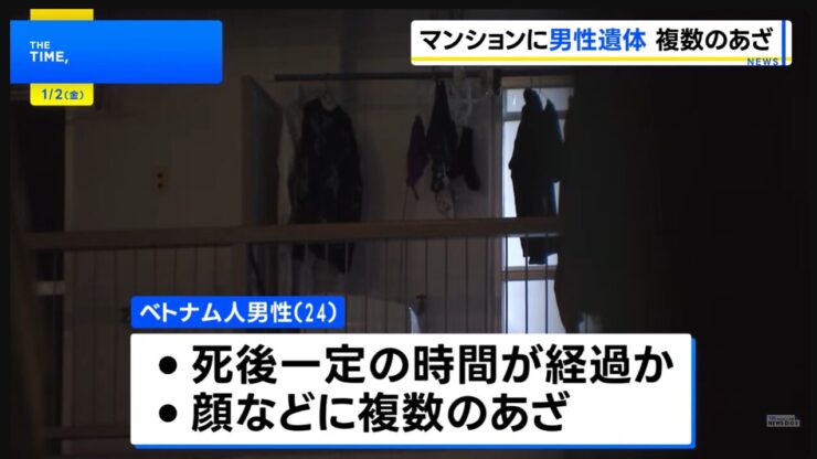 2026年1月1日午後、埼玉県川口市のマンションで、24歳のベトナム人男性の遺体が発見されました。通報は「意識のない男性がいる」というもので、現場に駆けつけた警察と消防により、男性がすでに死亡していることが確認されました。遺体には顔など複数のあざが確認され、死後しばらく時間が経過していたとみられています。