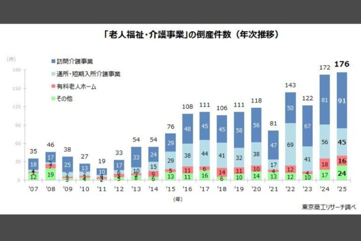 2025年の介護事業者(老人福祉・介護事業)の倒産は、176件(前年比2.3%増)で、2年連続で最多を更新した。コロナ禍前の2019年(111件)と比べ、約6割増えた。求人難15件を中心に「人手不足」倒産が29件(前年比45.0%増)と最多を更新した。