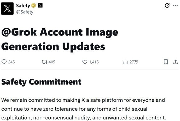 米Xは1月14日(現地時間)、X上のAI「Grok」が児童の性的画像や合意のないヌード画像を生成すると非難されていることを受け、Grokを更新し、「ビキニなどの露出度の高い服装をした実在の人物の画像の編集をGrokアカウントで禁止するための技術的対策を導入した」と発表した。