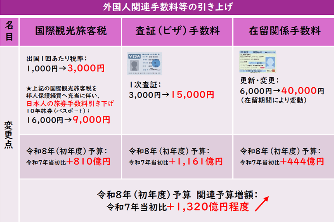 令和7年12月26日に閣議決定された令和8年度予算案では、外国人施策等の財源確保に向けて、諸外国の水準とも照らし合わせながら、主に3つの外国人の関連手数料等を引き上げます。近年オーバーツーリズムや不法滞在者による治安懸念といった外国人を巡るさまざまな社会問題が多発する中で、手数料引き上げに伴う財源確保で外国人問題対策への充実を図ります。