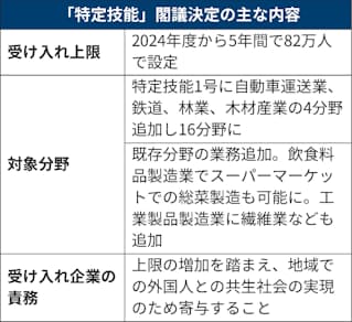 政府は29日、「特定技能」外国人の受け入れ枠の上限数や分野の追加について閣議決定した。2024年度から5年間の上限をこれまでの2倍超となる82万人に設定し、新たに自動車運送業、鉄道など4分野を追加した。人手不足が深刻な多くの分野で特定技能が不可欠な存在になっている。(略)