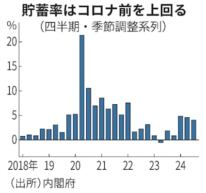 内閣府によると、家計の貯蓄率(四半期は季節調整値)は24年4〜6月期に4.4%、7〜9月期に3.9%となり、新型コロナ禍前の19年の2.9%を上回って推移する。