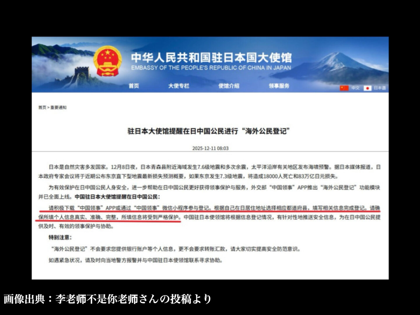【中国大使館が緊急通知】在日中国人に「海外公民登録」を呼びかけ 中国領事アプリなどの登録で日本の住所入力も求められ、義務ではないものの“監視では?”と話題に[X情報]