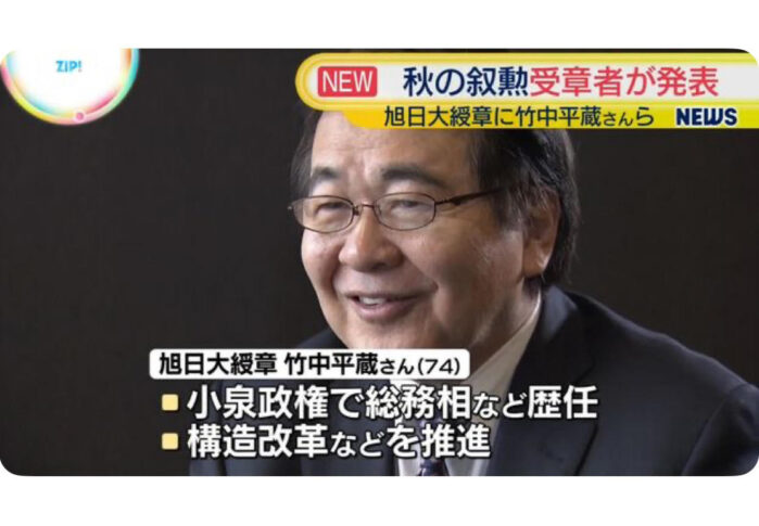 【秋の叙勲】旭日大綬章に竹中平蔵氏ら受章[日テレ]