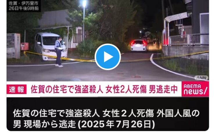 玄関を開けた瞬間、外国人風の男が刃物で親子の顔と首を刺し、娘は死亡 母親は病院に搬送 男は逃走…佐賀県警が強盗殺人事件として捜査 [読売新聞より]※動画あり