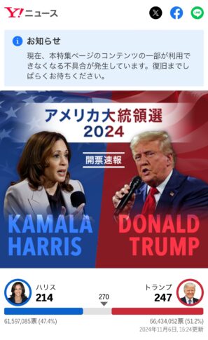 アメリカ大統領選2024 開票速報 – Yahoo!ニュースが不吉→現在、本特集ページのコンテンツの一部が利用できません。