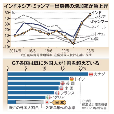 日本で暮らす外国人が国想定の1.5倍で増えている。現在は約320万人で、国は欧米並みに人口の1割を超える時期を2067年ごろと想定するが、10年ほど早まるペースだ。今の子どもたちが働き盛りになる頃には本格的な多国籍社会となる。準備期間を活用し、公的機関の多言語対応や母語が外国語の児童生徒への教育の整備を加速する必要がある。