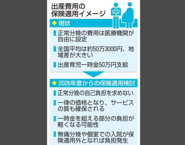 政府は、正常分娩での出産費用に2026年度から公的医療保険を適用し、自己負担を求めない方向で検討に入った。病気やけがの保険診療では医療費の1~3割が患者の自己負担となるが、出産費用には別の枠組みを設けて「自己負担なし」とする案がある。経済的な負担を軽減し、少子化対策につなげたい考え。厚生労働省とこども家庭庁が有識者会議を来月にも新設し、保険適用の対象とする正常分娩の範囲などの議論を本格化させる。関係者が21日、明らかにした。