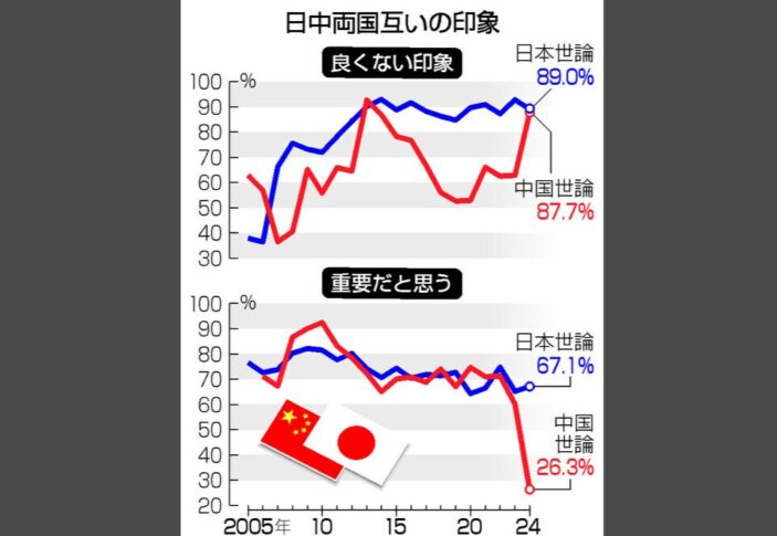 日中共同世論調査の結果、中国人の日本への印象が「良くない」とする割合が87.7%に達し、過去最悪となったことは、日中関係の現状を考える上で非常に重要な指標だと感じます。さらに、「日中関係の重要度」についても中国側で大幅に低下しているという事実は、両国間の信頼関係が大きく揺らいでいることを物語っています。この調査結果を受けて、日中関係の未来について真剣に考えなければならないと感じます。