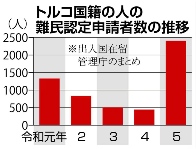 • 日本ではクルド人とみられるトルコ人からの難民認定申請が令和5年に前年の5倍の2406人に急増 迫害の事実もないのにこれは異常です。