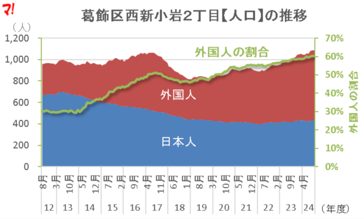 移民社会の一端!葛飾区の西新小岩2丁目は60.5%が外国人!10年前の36.1%から激増です!