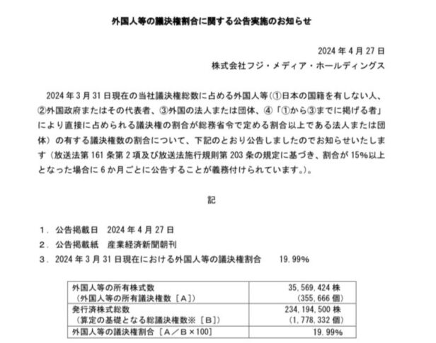 【証券マンさんのポスト】フジテレビ 3月31日時点で外国人の議決権比率19.99% →20%を超えると認定放送持株会社の認定が取り消し