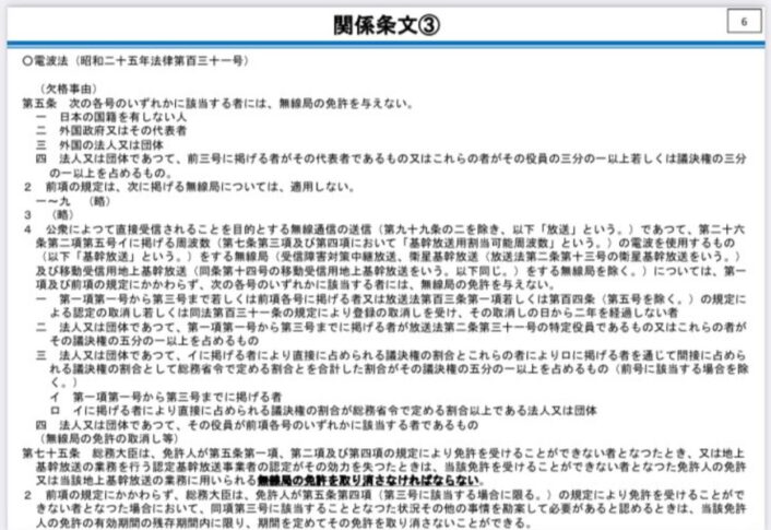 - 東北新社は免許を取り消され、他方、(外国人等議決権比率が外資規制を超えている)フジテレビと日本テレビが見逃されているのはどういうわけでしょうか。法の下の平等や公平性、公正性に反するように思われます。」 これに対し武田大臣は「適切に対処してまいりたい」とだけ述べた 日本の闇