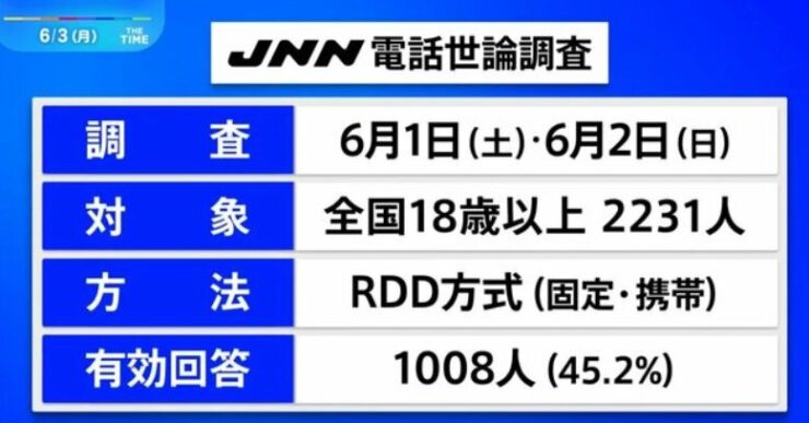 【調査方法】 JNNではコンピュータで無作為に数字を組み合わせ、固定電話と携帯電話両方をかけて行う「RDD方式」を採用しています。 6月1日(土)、2日(日)に全国18歳以上の男女2231人〔固定890人、携帯1341人〕に調査を行い、そのうち45.2%にあたる1008人から有効な回答を得ました。その内訳は固定電話503人、携帯505人でした。 インターネットによる調査は、「その分野に関心がある人」が多く回答する傾向があるため、調査結果には偏りが生じます。より「有権者の縮図」に近づけるためにもJNNでは電話による調査を実施しています。無作為に選んだ方々に対し、機械による自動音声で調査を行うのではなく、調査員が直接聞き取りを行っています。固定電話も年齢層が偏らないよう、お住まいの方から乱数で指定させて頂いたお一人を選んで、質問させて頂いています。