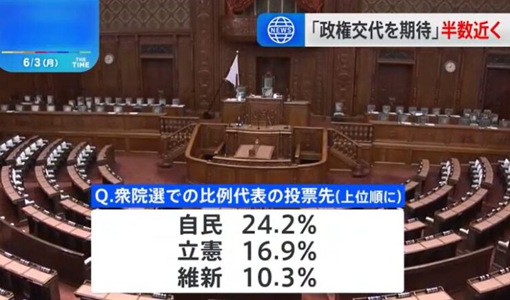 また政党支持率では▼自民党の支持が前回の調査から0.4ポイント上昇し、23.8%、▼立憲民主党は2.9ポイント下落し7.3%、▼日本維新の会は0.3ポイント下落し、4.3%でした。 一方、いま衆議院選挙が行われた場合の投票先を聞いたところ、結果は次の通り。▼自民党24.2%、▼立憲民主党16.9%、▼日本維新の会10.3%、▼公明党5.4%、▼共産党5.5%、▼国民民主党5.1%、▼教育無償化を実現する会0.8%、▼れいわ新選組4.0%、▼社民党0.8%、▼参政党1.7%、▼それ以外の政党0.7%。