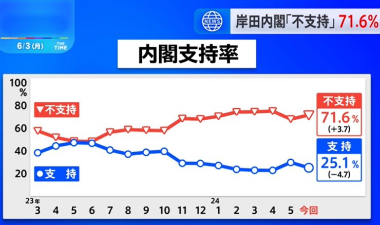 【岸田内閣】支持率25.1% 先月から4.7ポイント下落 6月JNN世論調査