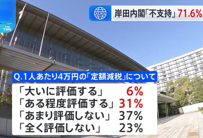 岸田内閣の支持率が先月の調査から4.7ポイント下落し、25.1%だったことが最新のJNNの世論調査でわかりました。 不支持率は先月の調査から3.7ポイント上昇し、71.6%でした。
