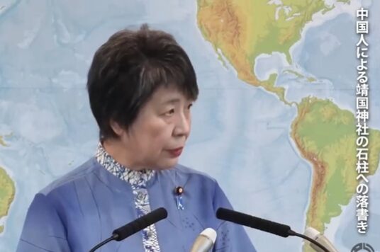 上川陽子外相は4日の記者会見で、東京・九段北の靖国神社の石柱に落書きが見つかり、中国籍男性の関与が疑われている事件について、中国側に外交ルートを通じて「懸念を表明した」と明らかにした。