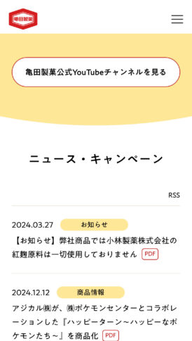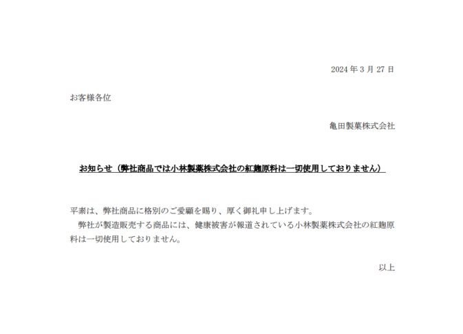 >【亀田製菓】弊社商品では小林製薬株式会社の紅麹原料は一切使用しておりません!…