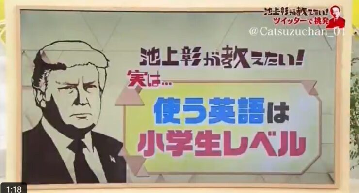 池上彰氏「「実は(トランプ次期大統領の)、使う英語は小学生レベル」。トランプ次期大統領は怒った方が良いと思います。池上彰「インテリに嫌われている。アメリカの大統領なんだから、もうちょっと知識のある言い回しがあるのではって言いたい人がいる一方で、多くの人は分かりやすくていいと言う」 どうせトランプさんは、番組を見ないと思って言いたい放題だな。この池上彰の特番で、池上彰はトランプさんを目の敵にしていました。池上彰さんはトランプ次期大統領が嫌いなんですね。 トランプさんが前の大統領時代の2018年8月の放送。