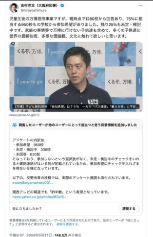 「2025年大阪・関西万博」に大阪府内の小・中・高校およそ1900校、102万人の生徒を無料招待するとぶち上げた吉村洋文大阪府知事。