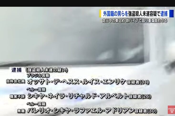 【向井記者】 「容疑者らは走っていた被害者の車を、複数台の車で取り囲み、犯行に及んだといみられています」 強盗殺人未遂の疑いで逮捕されたブラジル国籍のオッサト・デ・ヘスス・ルイス・エンリケ容疑者(31)ら3人は、先月25日午後9時半頃、広島市西区庚午中の路上で、外国籍の40代男性を鉄パイプで殴るなどして殺害しようとしたうえ、貴金属を奪った疑いが持たれています。