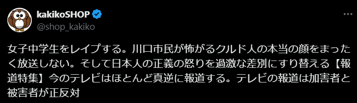 kakikoSHOPさんの投稿】女子中学生をレ〇プする。川口市民が怖がるクルド人の本当の顔をまったく放送しない。そして日本人の正義の怒りを過激な差別にすり替える報道特集】今のテレビはほとんど真逆に報道する。