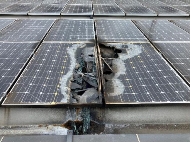 屋根上太陽光に直撃雷、パネルに穴が空き、接続箱にも延焼
