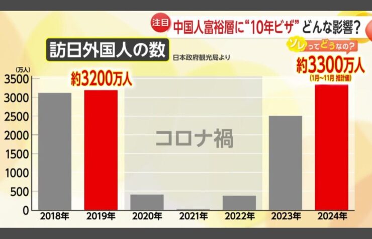 青井実キャスター: 中国人向けのビザの要件が緩和される背景には、こんな数字があるんです。2024年、日本を訪れた外国人観光客は11月までに3300万人を超え、コロナ前で最も多かった2019年を既に上回りました。