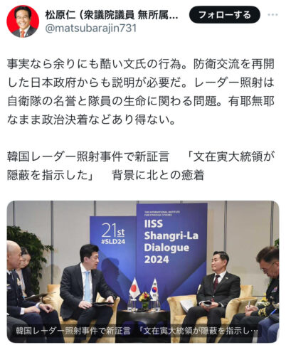 【松原仁(衆議院議員 無所属 東京26区 目黒区・大田区)まつばら仁氏の投稿】事実なら余りにも酷い文氏の行為。防衛交流を再開した日本政府からも説明が必要だ。レーダー照射は自衛隊の名誉と隊員の生命に関わる問題。有耶無耶なまま政治決着などあり得ない。 韓国レーダー照射事件で新証言 「文在寅大統領が隠蔽を指示した」 背景に北との癒着