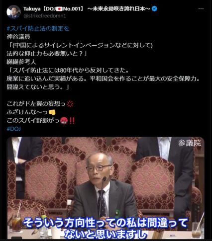 Takuya【DOJ No.001】 〜未来永劫咲き誇れ日本〜さんの投稿】#スパイ防止法の制定を 神谷議員 「(中国によるサイレントインベージョンなどに対して) 法的な抑止力も必要無いと?」 纐纈参考人 「スパイ防止法には80年代から反対してきた。 廃案に追い込んだ実績がある。平和国会を作ることが最大の安全保障力。間違えてないと思う。」 これがド左翼の妄想っ💢ふざけんな〜っ👊このスパイ野郎がっ😡(全文は引用元へ…)