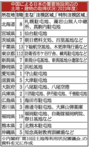 自衛隊や米軍施設、空港、原子力発電所など、国の安全保障に関わる重要施設の周辺、国境の離島などで外国人や外国法人が土地や建物の取得が相次ぎ、政府が実態把握を進めている。23日に開いた審議会では、防衛省市ケ谷庁舎周辺をはじめ、北海道から沖縄まで全国371カ所の取得事例が公表されたが、その半分以上が中国によるものだった。「台湾有事」をにらんで東アジア情勢が緊迫度を増している。識者は、外資の不動産取得規制について、強制力を持つ仕組みが必要だと訴える。