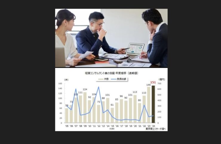 2024年の「経営コンサルタント業」の倒産が154件(前年比7.6%増)に達した。集計開始以降で年間最多だった2023年の143件を上回り、過去最多を更新した。コンサル業界は1人でも少ない開業資金でスタートでき、参入障壁が低い。だが、参入が容易でも、コロナ禍を経て改めて実績や特色が重視され、玉石混交のコンサル業界では淘汰が加速している。