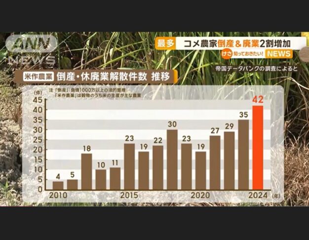 帝国データバンクによりますと、去年1年間のコメ農家の倒産・廃業件数は42件でした。前の年から2割増加し、年間の最多件数を更新しました。