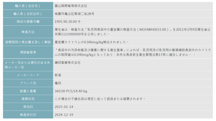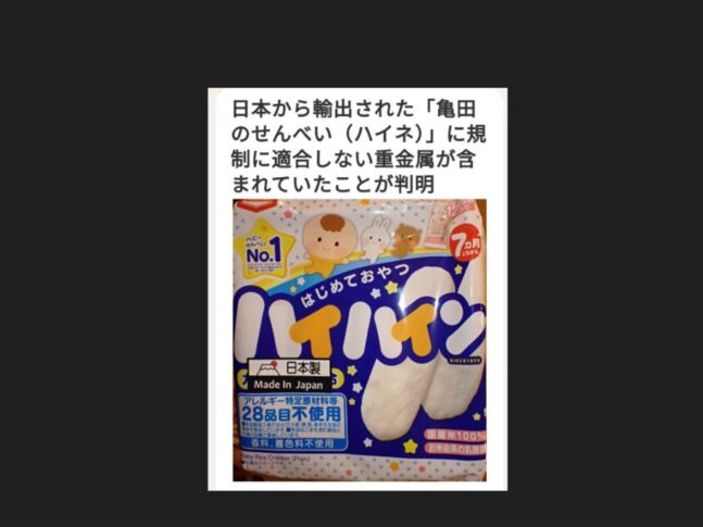 日本から輸出された「亀田のせんべい(ハイネ)」に規制に適合しない重金属が含まれていたことが判明
