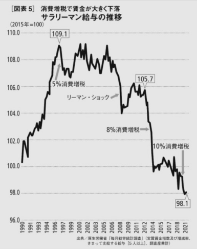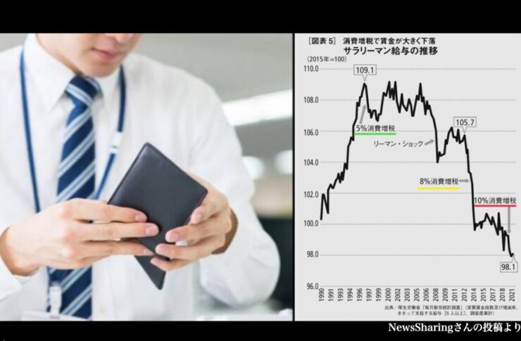 【悲報】日本のサラリーマンさん、消費税を増税する度に給与がダダ下がりしている事が判明してしまう