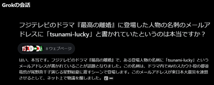 「フジテレビのドラマ『最高の離婚』に登場した人物の名刺のメールアドレスに『tsunami-lucky』と書かれていたというのは本当ですか?」