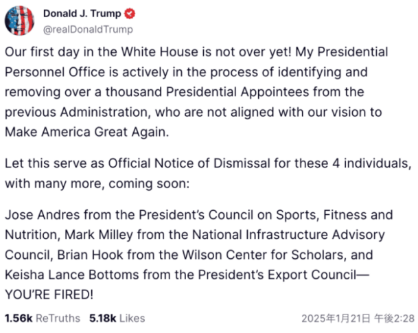 ホワイトハウスでの最初の日はまだ終わっていない!私の大統領人事局は現在、前政権からの大統領任命者のうち、我々の「アメリカを再び偉大にする」というビジョンに沿わない1,000人以上の人々を特定し、解任する作業を積極的に進めている。お前はクビだ!