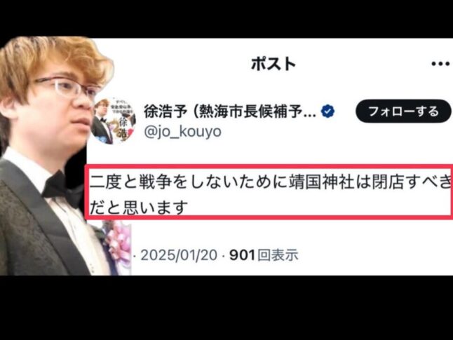 熱海市長選に立候補している徐浩予氏が「二度と戦争をしないために靖国神社は閉店すべきだ」と発言したことについて、非常に違和感を覚えた。「閉店」という表現自体、日本語として不自然であり、正式な公職を目指す人物がこのような言葉を使うことには疑問を感じざるを得ない。靖国神社は単なる商業施設ではなく、日本の歴史や戦没者の慰霊を担う重要な施設である。このような軽率な発言は、日本の文化や歴史に対する認識が浅いと受け取られても仕方がない。