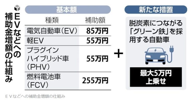 経済産業省は、電気自動車(EV)などのエコカー購入者への補助金を4月から一部引き上げる方針を固めた。二酸化炭素(CO2)の排出を抑えて製造した鋼材(グリーン鉄)を車体に採用する自動車メーカーの車で、補助金を最大5万円増やす。走行時だけでなく製造過程でもCO2を削減するため、鋼材を供給する鉄鋼メーカーに脱炭素投資を促す。