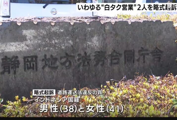 静岡県富士市の観光地を訪れる客に対して、いわゆる「白タク営業」を行ったとして逮捕された男女2人が略式起訴されました。 道路運送法違反の罪で7月5日、略式起訴されたのは、いずれもインドネシア国籍の38歳の男性と41歳の女性です。 起訴状などによりますと2人は2024年6月、自家用車2台に18人を乗せ、東京から山梨を経由して富士市内まで運び、代金49万5000円を受け取るいわゆる白タク行為をしたとされています。