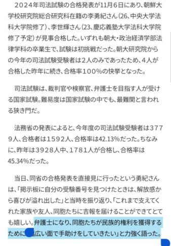 また、朝鮮学校出身者の合格率が100%というのも驚きだ。一般的に司法試験は非常に難関とされており、合格率は決して高くない。こうした中で、朝鮮大学の合格率が突出している背景にはどのような要因があるのか。教育環境や支援体制の充実がその一因かもしれないが、それだけでは説明がつかない部分もある。試験対策やカリキュラムの独自性が影響している可能性もあるだろうが、公平性や透明性の観点からも、より詳しく検証されるべきではないか。