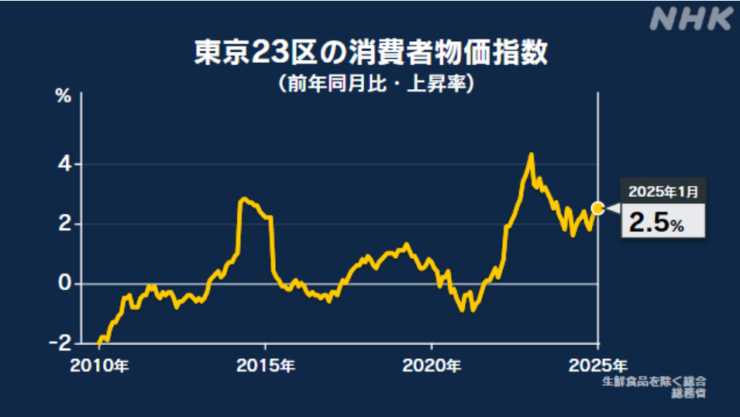 東京23区の1月の消費者物価指数が発表され、生鮮食品を除いた総合の速報値が108.7となり、前年同月比で2.5%の上昇を記録した。この上昇率は、昨年12月の2.4%からさらに0.1ポイント上昇しており、3か月連続で2%台のインフレが続いていることになる。物価の上昇は家計に大きな影響を及ぼしており、中でも食料品の価格高騰が顕著だ。