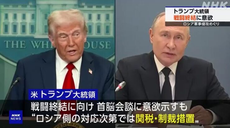 トランプ大統領は早期の戦闘終結に向けて、プーチン大統領との首脳会談に意欲を示す一方、ロシア側の対応次第では関税や制裁の措置をとるとして揺さぶりもかけていて、具体的な協議が進むか注目が集まっています。